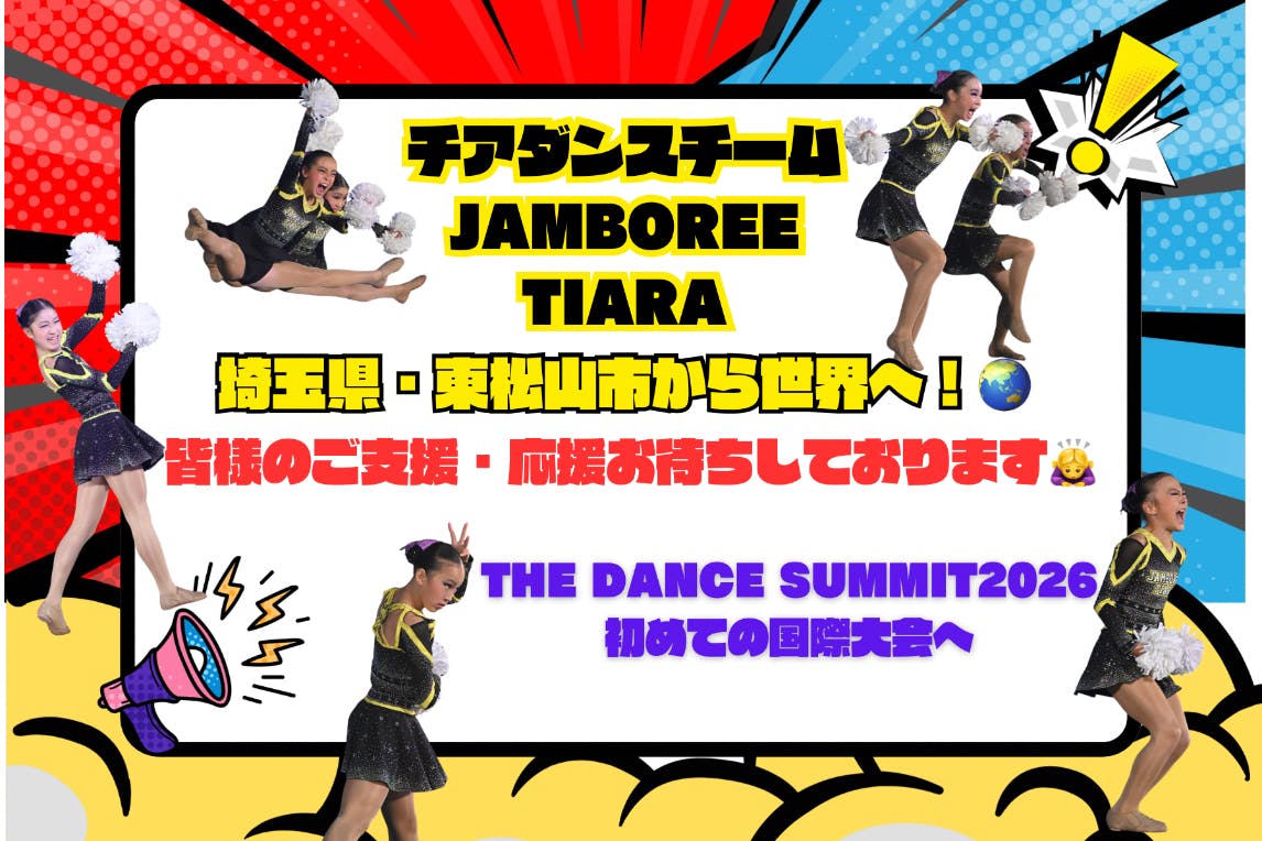 2010年に設立された「チアダンスチームJAMBOREE(ジャンボリー)」は、東松山南地区体育館などを拠点に活動している活気あふれるクラブチームです。年中さんから中学3年生まで、幅広い年代のお子さんが所属しています。